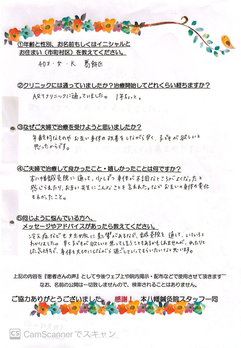 【主訴・年齢・性別】 妊活・40歳・女性 【クリニックには通っていましたか?治療開始してどれくらい経ちますか?】 ARTクリニックに通っていました。1年ちょっと。 【なぜご夫婦で治療を受けようと思いましたか?】 年齢的なものやお互いの身体の改善をしながら、早く子どもが欲しいと思ったからです。 【ご夫婦で治療して良かった事・うれしかった事は何ですか?】 本八幡鍼灸院に通って、少しずつ身体の不調なところがよくなったと感じられたり、お互い先生にこんなことを言われた。などお互いの身体の変化もわかったこと。 【同じように悩んでいるベビ待ちさんへメッセージがあったら教えてください。】 冷え性なども妊娠に影響があるなど、鍼灸院を通して、いろいろとわかりました。 早く子どもが欲しいと焦ってしまうこともあるかもしれませんが、ゆったりとした気持ちで、身体を大切にしながら過ごしていってもらいたいなと思います。![]()