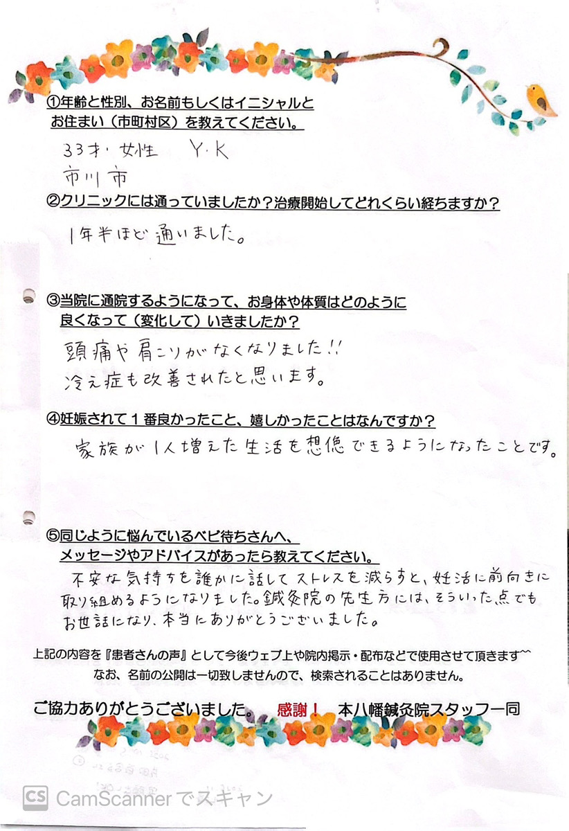 【主訴・年齢・性別】 妊活・33歳・女性 【クリニックには通っていましたか?治療開始してどれくらい経ちますか?】 1年半ほど通いました。 【当院の通院するようになって、お身体や体質はどのように変化していきましたか?】 頭痛や肩こりがなくなりました!! 冷え性も改善されたと思います。 【妊娠されて1番良かったこと、嬉しかったことはなんですか?】 家族が一人増えた生活を想像できるようになった。 【同じように悩んでいるベビ待ちさんへメッセージがあったら教えてください。】 不安な気持ちを誰かに話してストレスを減らすと、妊活に前向きに取り組めるようになりました。 鍼灸院の先生方には、そういった点でもお世話になり、本当にありがとうございました。![]()
