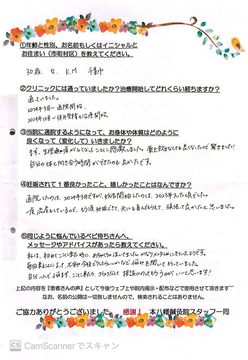 【主訴・年齢・性別】 妊活・30歳・女性 【クリニックには通っていましたか?治療開始してどれくらい経ちますか?】 通っていました。 2024年3月~通院開始 2024年10月~体外受精の治療開始 【当院の通院するようになって、お身体や体質はどのように変化していきましたか?】 まず、生理痛がなくなったことに感激しました。 薬を飲まなくても良くなったので驚きました! 自分の体と向き合う時間ができたのも良かったです。 【妊娠されて1番良かったこと、嬉しかったことはなんですか?】 通院したのは、2024年3月ですが、妊活開始をしたのは、2023年に入った頃でした。 一度流産もしているので、もう1度妊娠できて、夫にも喜んでもらえて、頑張って良かったと思いました。 【同じように悩んでいるベビ待ちさんへメッセージがあったら教えてください。】 私は、初めてここに来た時に、めちゃくちゃ泣いてました。 かなりメンタルにきていたようです。 毎回来ることによって、不安や今後どうしたらいいかなど悩みを聞いてもらっていました。 自分一人で悩まず、ここに来たらさらけだして、相談にのってもらうのがいいと思います。![]()