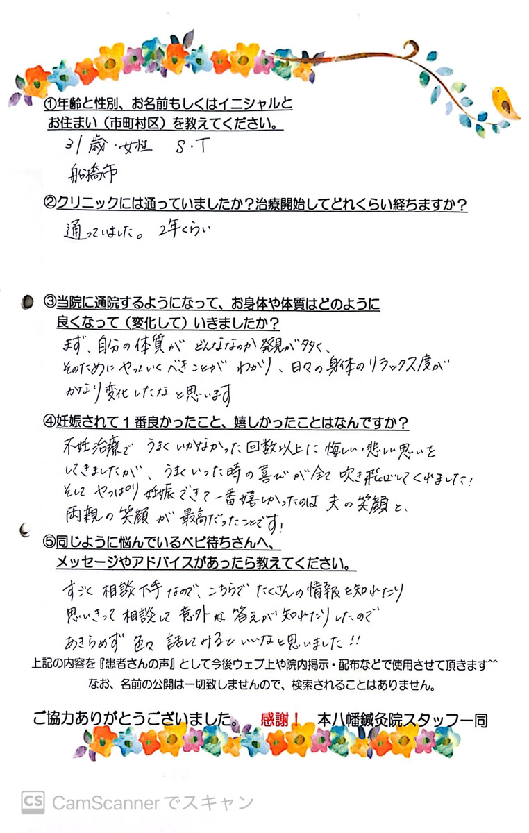 【主訴・年齢・性別】 妊活・31歳・女性 【クリニックには通っていましたか?治療開始してどれくらい経ちますか?】 通っていました。2年くらい。 【当院の通院するようになって、お身体や体質はどのように変化していきましたか?】 まず、自分の体質がどんななのか発見が多く、そのためにやっていくべきことがわかり、日々の身体のリラックス度がかなり変化したなと思います。 【妊娠されて1番良かったこと、嬉しかったことはなんですか?】 不妊治療でうまくいかなかった回数以上に、悔しい・悲しい思いをしてきましたが、うまくいった時の喜びが全て吹き飛ばしてくれました! そしてやっぱり妊娠できて一番嬉しかったのは、夫の笑顔と、両親の笑顔が最高だったことです! 【同じように悩んでいるベビ待ちさんへメッセージがあったら教えてください。】 すごく相談下手なので、こちらでたくさんの情報を知れたり、思いきって相談して意外な答えが知れたりしたので、あきらめず色々話してみるといいなと思いました!!![]()