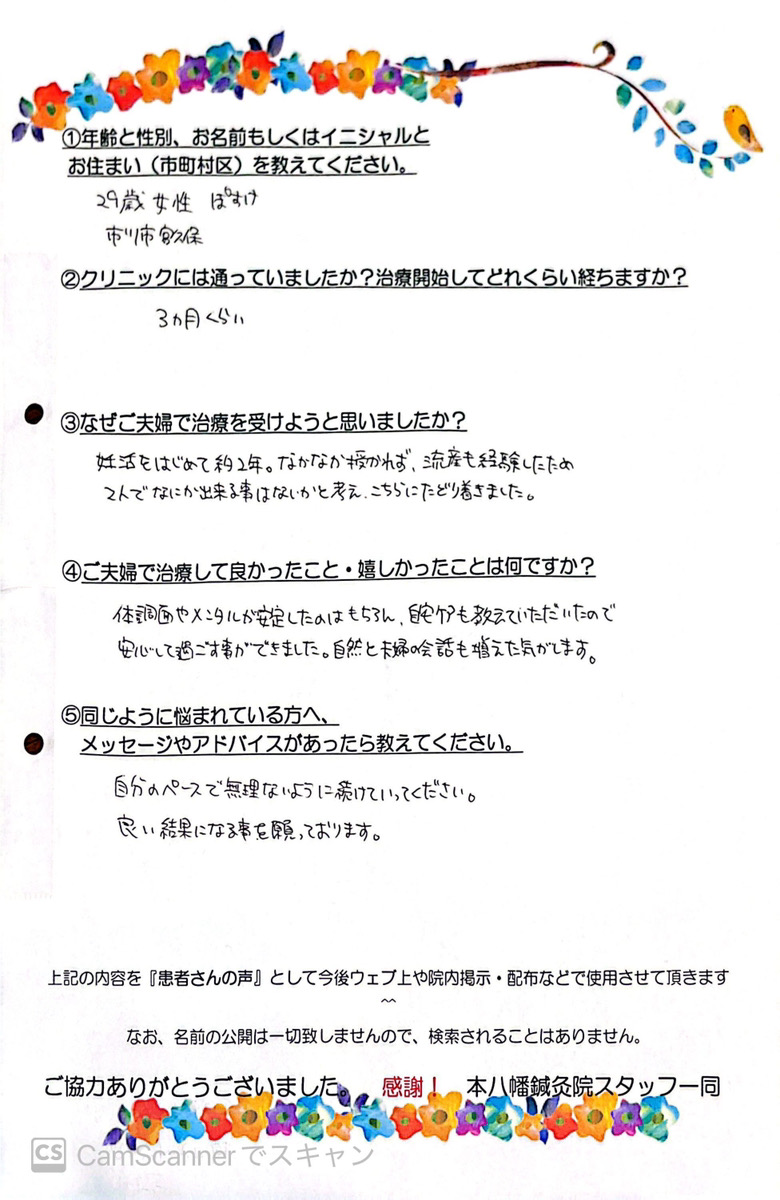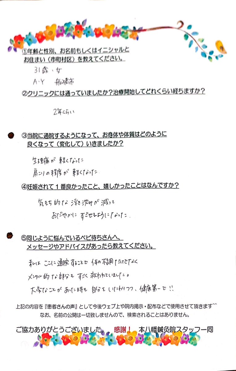 【主訴・年齢・性別】 妊活・35歳・女性 【クリニックには通っていましたか?治療開始してどれくらい経ちますか?】 1年半ほど 【当院の通院するようになって、お身体や体質はどのように変化していきましたか?】 肩こりがだいぶ改善されてラクになりました。 滞っていた血流が良くなった気がします。 【妊娠されて1番良かったこと、嬉しかったことはなんですか?】 結婚して約8年経ってからの、ようやく第一子を妊娠なので、ついに・・・私にも・・・と感慨深かったです。 エコーで赤ちゃんの成長を見るのが毎回楽しみです。 【同じように悩んでいるベビ待ちさんへメッセージがあったら教えてください。】 妊活はつらいことも多いと思いますが、一人でためこみすぎずに、やさしい本八幡鍼灸院の先生たちに気軽に相談するのが良いと思います。 皆さんのもとにも赤ちゃんが来てくれますように♡