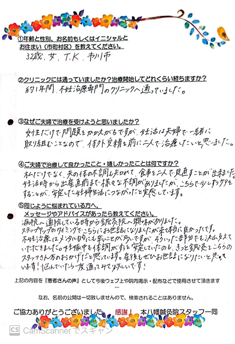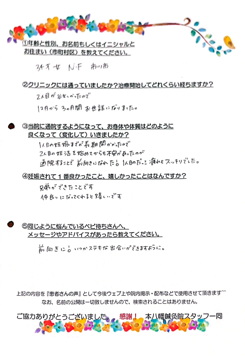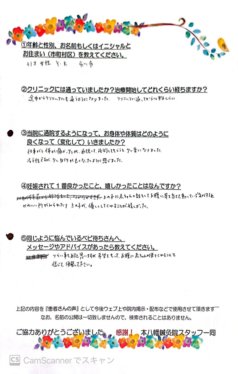 【主訴・年齢・性別】 妊活・31歳・女性 【クリニックには通っていましたか?治療開始してどれくらい経ちますか?】 途中からクリニックにも通うようになりました。 クリニックに通ってからは半年くらい。 【当院の通院するようになって、お身体や体質はどのように変化していきましたか?】 仕事がら体が痛かったが、通院して、施術してもらうと少し楽になりました。 冷え性ですが、少し血行が良くなったように感じました。 【妊娠されて1番良かったこと、嬉しかったことはなんですか?】 上の子に赤ちゃんの話をして、お腹に耳を当てて動いている気がすると、かわいい所がみられたり、上の子が優しくしてくれることが嬉しかった。 【同じように悩んでいるベビ待ちさんへメッセージがあったら教えてください。】 つらい事もあると思いますが、希望をもって、お腹に赤ちゃんが来てくれることを信じて頑張って下さい。