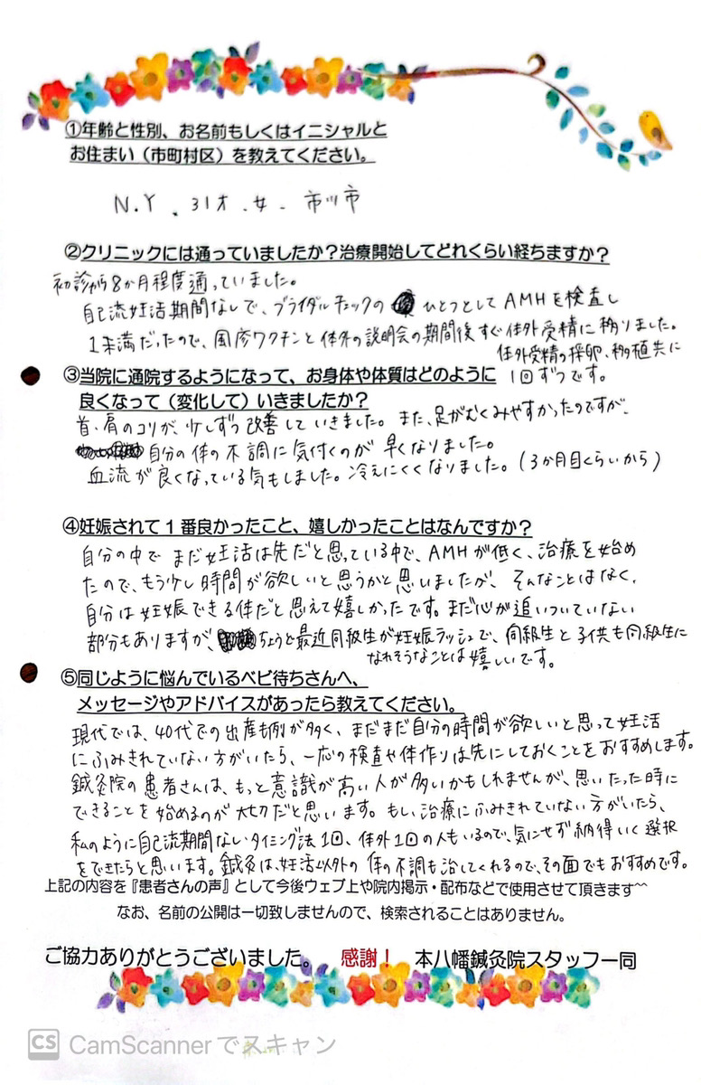 【主訴・年齢・性別】 妊活・31歳・女性 【クリニックには通っていましたか?治療開始してどれくらい経ちますか?】 初診から8カ月程通っていました。 自己流妊活期間なしで、ブライダルチェックのひとつにAMHを検査し、1未満だったので、風疹ワクチンと体外の説明会の期間後すぐに体外受精に移りました。 体外受精の採卵、移植共に1回ずつです。 【当院の通院するようになって、お身体や体質はどのように変化していきましたか?】 首、肩のコリが少しずつ改善していきました。また、足がむくみやすかったのですが、自分の体の不調に気付くのが早くなりました。 血流が良くなっている気もしました。 冷えにくくなりました。(3か月目くらいから) 【妊娠されて1番良かったこと、嬉しかったことはなんですか?】 自分の中でまだ妊活は先だと思っている中で、AMHが低く、治療を始めたので、もう少し時間が欲しいと思うかと思いましたが、そんなことはなく、自分は妊娠できる体だと思えたことが嬉しかったです。 まだ心が追いついていない部分もありますが、ちょうど最近同級生が妊娠ラッシュで、同級生と子供も同級生になれそうなことは嬉しいです。 【同じように悩んでいるベビ待ちさんへメッセージがあったら教えてください。】 現代では、40代での出産例が多く、まだまだ自分の時間が欲しいと思って妊活にふみきれない方がいたら、一応検査や体作りは先にしておくことをおすすめします。 鍼灸院の患者さんは、もっと意識が高い人が多かったかもしれませんが、思いたった時にできることを始めるのが、大切だと思います。 もし、治療にふみきれていない方がいたら、私のように自己流期間なし、タイミング法1回、体外1回の人もいるので、気にせず納得いく選択をできたらと思います。 鍼灸は、妊活以外の体の不調も治してくれるので、その面でもおすすめです。