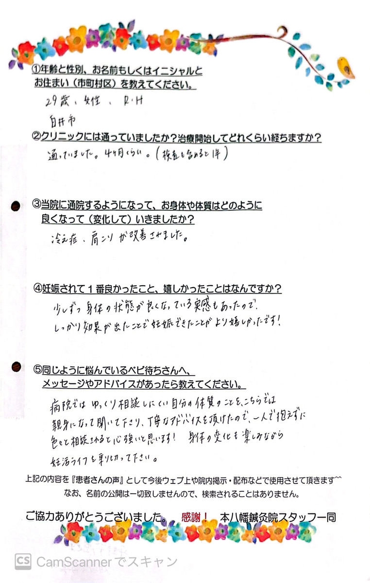 【主訴・年齢・性別】 妊活・29歳・女性 【クリニックには通っていましたか?治療開始してどれくらい経ちますか?】 通っていました。4カ月くらい。(検査も含めると1年) 【当院の通院するようになって、お身体や体質はどのように変化していきましたか?】 冷え性、肩こりが改善されました。 【妊娠されて1番良かったこと、嬉しかったことはなんですか?】 少しずつ身体の状態が良くなっている実感があったので、しっかり効果が出たことで妊娠できたことがより嬉しかったです! 【同じように悩んでいるベビ待ちさんへメッセージがあったら教えてください。】 病院ではゆっくり相談しにくい自分の体質のことを、こちらでは親身になって聞いて下さり、丁寧なアドバイスを頂けたので、一人で抱えずに色々と相談されると心強いと思います! 身体の変化も楽しみながら妊活ライフを乗り切って下さい。