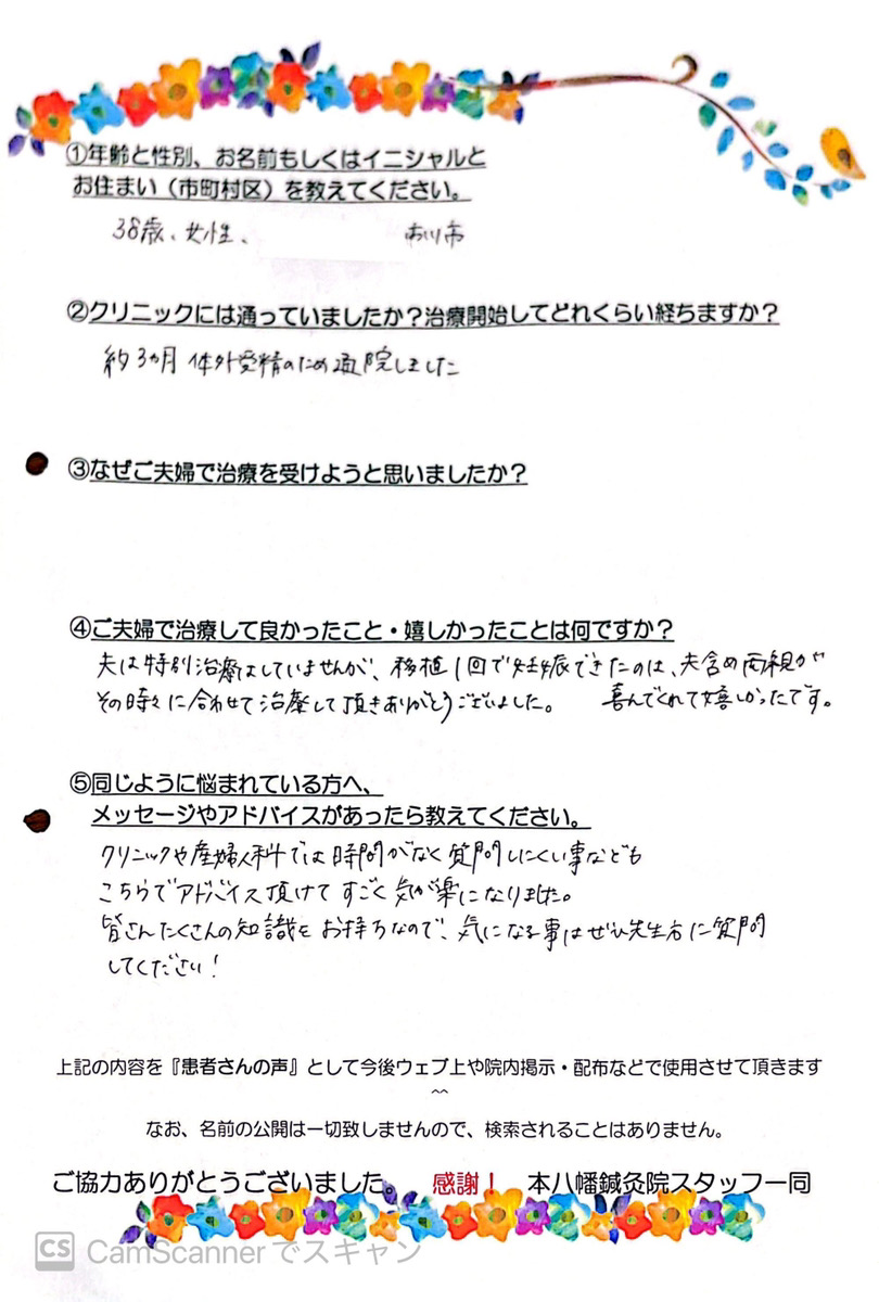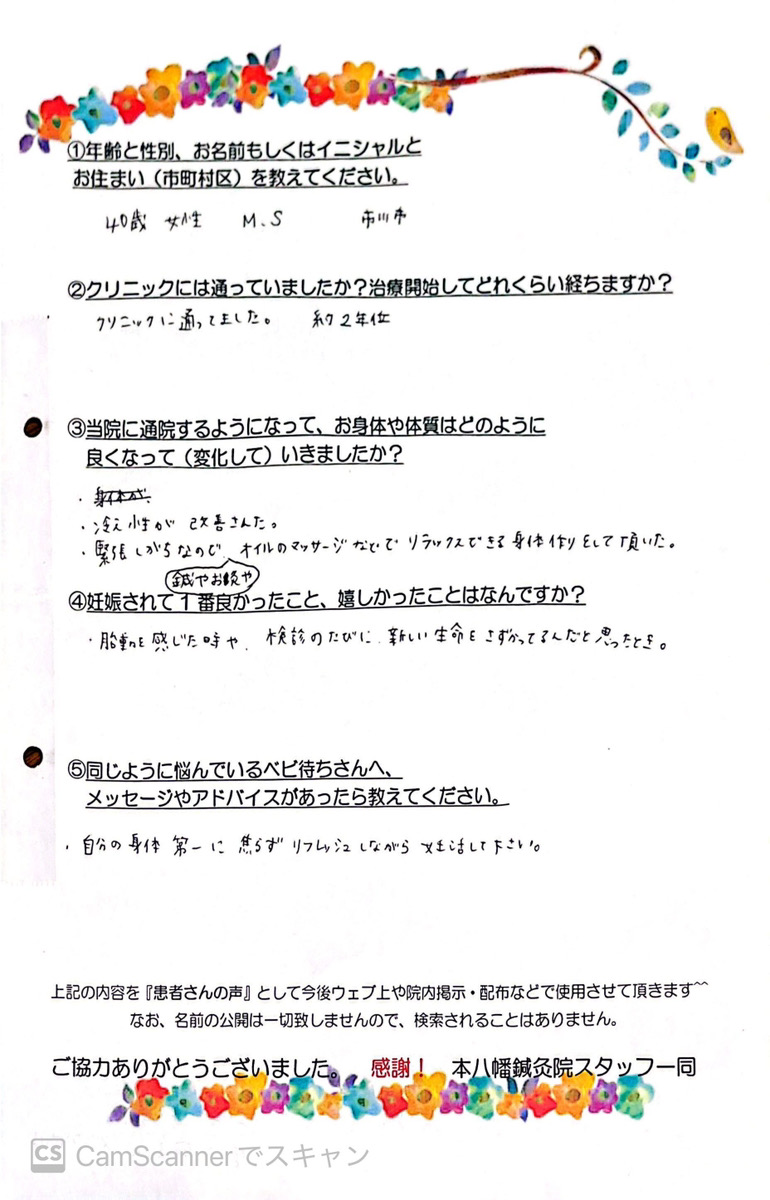 【主訴・年齢・性別】 妊活・40歳・女性 【クリニックには通っていましたか?治療開始してどれくらい経ちますか?】 クリニックに通っていました。 約2年くらい。 【当院の通院するようになって、お身体や体質はどのように変化していきましたか?】 冷え性が改善されました。 緊張しがちなので、鍼やお灸やオイルマッサージなどで、リラックスできる身体作りをして頂いた。 【妊娠されて1番良かったこと、嬉しかったことはなんですか?】 胎動を感じた時や、検診のたびに、新しい生命をさずかってるんだと思ったとき。 【同じように悩んでいるベビ待ちさんへメッセージがあったら教えてください。】 自分の身体を第一に焦らずリフレッシュしながら妊活して下さい。