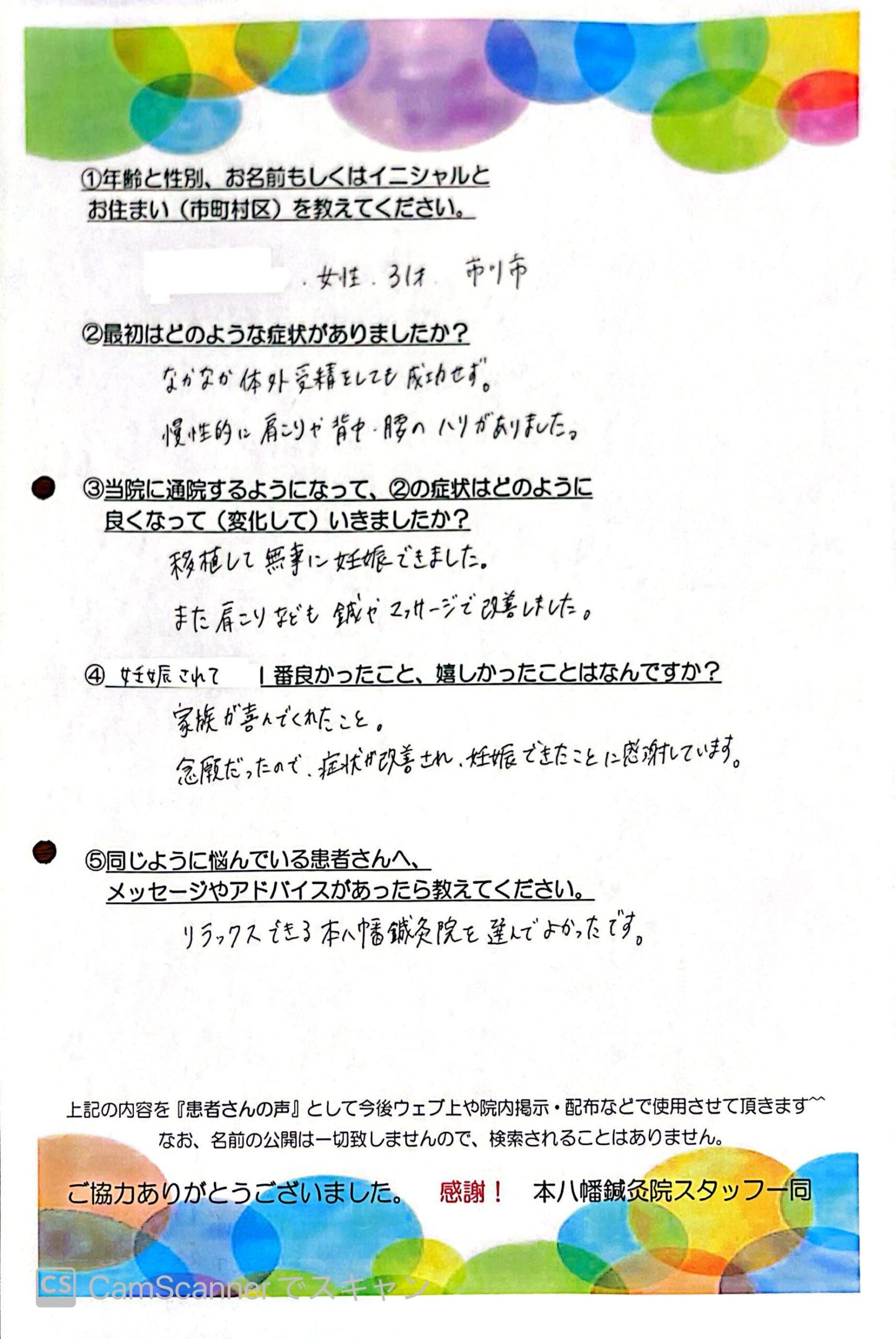 【主訴・年齢・性別】 妊活・31歳・女性 【クリニックには通っていましたか?治療開始してどれくらい経ちますか?】 なかなか体外受精をしても成功せず、慢性的に肩こりや背中、腰のハリがありました。 【当院の通院するようになって、お身体や体質はどのように変化していきましたか?】 移植して無事に妊娠できました。 また肩こりなども鍼やマッサージで改善しました。 【妊娠されて1番良かったこと、嬉しかったことはなんですか?】 家族が喜んでくれたこと。 念願だったので、症状が改善され、妊娠できたことに感謝しています。 【同じように悩んでいるベビ待ちさんへメッセージがあったら教えてください。】 リラックスできる本八幡鍼灸院を選んでよかったです。