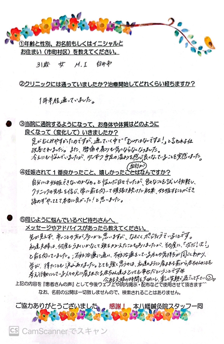 【主訴・年齢・性別】 妊活・31歳・女性 【クリニックには通っていましたか?治療開始してどれくらい経ちますか?】 1年半通っていました。 【当院の通院するようになって、お身体や体質はどのように変化していきましたか?】 足がむくみやすかったですが、通っていく中で「むくみはにですよ!」と言われる位改善されました。 また、腰痛や肩こりも気にならなくなりました。 冷えにも悩んでいましたが、少しずつ手足の温まりを感じ、血行が良くなっていることを実感しました。 【妊娠されて1番良かったこと、嬉しかったことはなんですか?】 自分には妊娠はできないのかなぁ。と悩んだ日々でしたが、色々なことを試し挑戦し、クリニックの先生を信じ、常に前を向いて頑張り続けた結果、妊娠することができ、諦めずやってきて本当に良かった!と思いました。 【同じように悩んでいるベビ待ちさんへメッセージがあったら教えてください。】 先が見えず、辛いことの方が多いかと思いますが、なるべくポジティブでいることです。 私達夫婦は、何度もうまくいかなくて頭をかかえたこともありましたが、その度に「次だ!次!」と前を向いていました。 不妊治療に通い、不妊治療をしている方々の気持ちが同じくわかり、学び、得たことも沢山ありました。 とても強く思うのは、私達のように生まれる前から赤ちゃんのことを考え、行動している人々の元に産まれてくる赤ちゃん達は、とっても幸せだということです。 今ある夫婦の時間を大切にし、楽しく笑顔で過ごして下さい(^^)