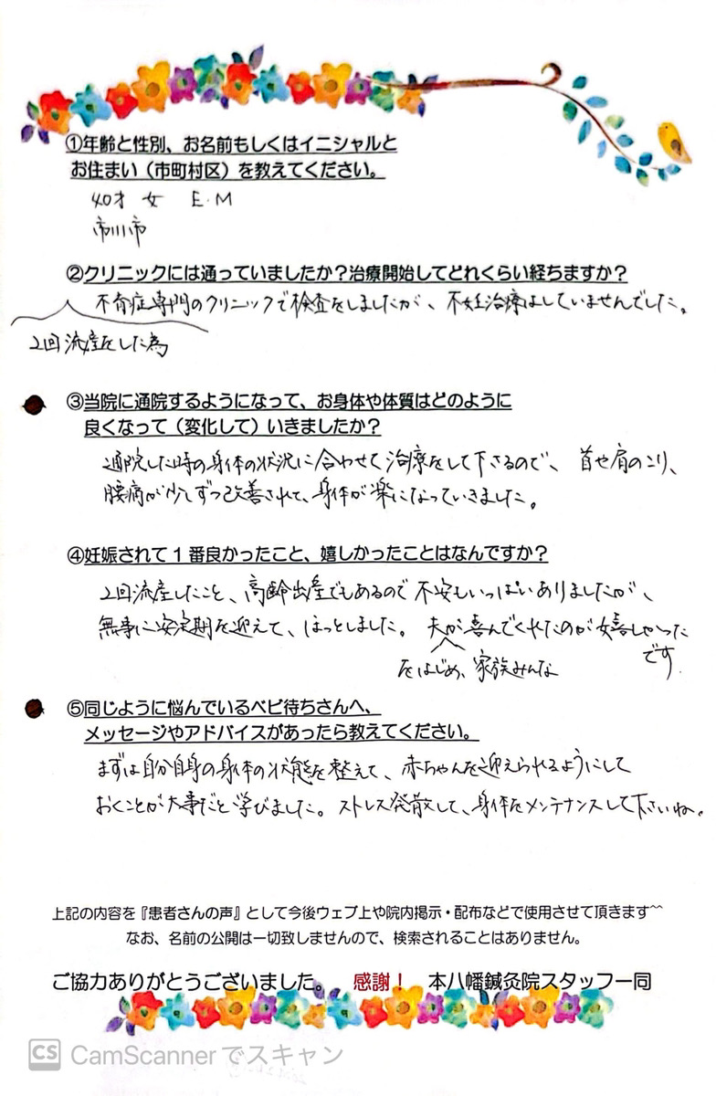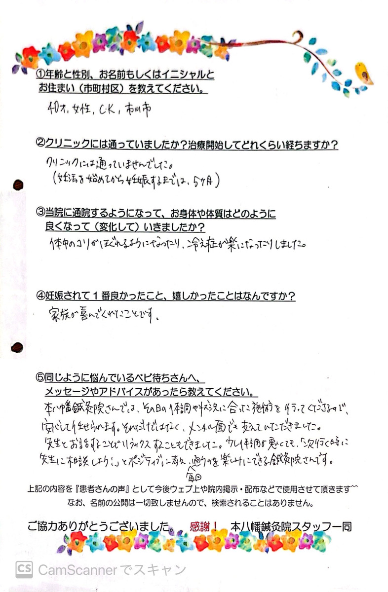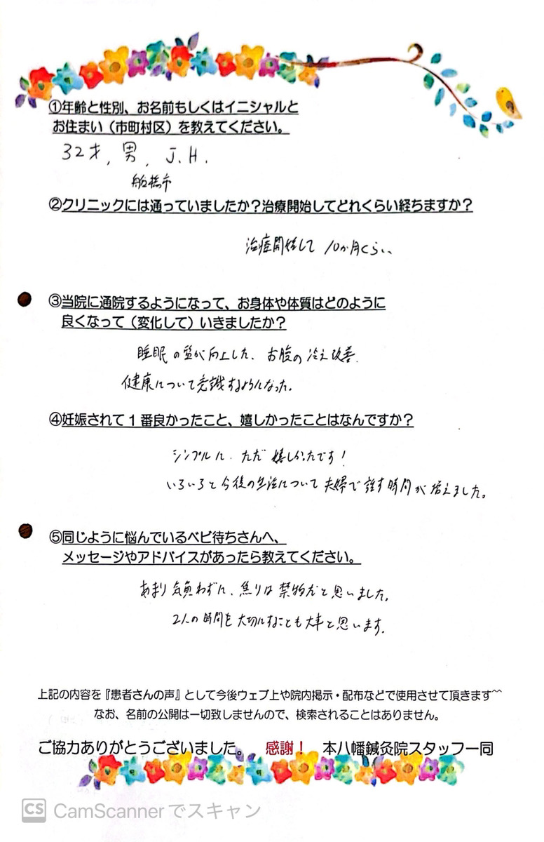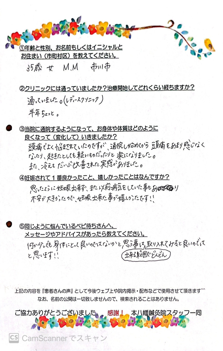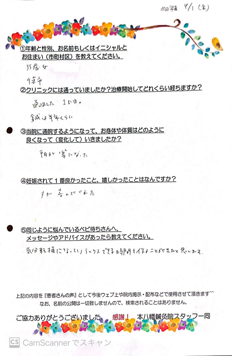 【主訴・年齢・性別】 妊活・40歳・女性 【クリニックには通っていましたか?治療開始してどれくらい経ちますか?】 クリニックには通っていません。 (妊活を始めてから妊娠するまでは、5カ月) 【当院の通院するようになって、お身体や体質はどのように変化していきましたか?】 体中のコリがほぐれるようになったり、冷え性が楽になったりしました。 【妊娠されて1番良かったこと、嬉しかったことはなんですか?】 家族が喜んでくれてたことです。 【同じように悩んでいるベビ待ちさんへメッセージがあったら教えてください。】 本八幡鍼灸院さんでは、その日の体調や状況に合った施術を行ってくださるので、安心して任せられます。 それだけでなく、メンタル面でも支えていただきました。 先生とお話することでリラックスすることもできました。 少し体調が悪くても、「次行くときに先生に相談しよう!」とポジティブに考え、毎回通うのを楽しみにできる鍼灸院さんです。