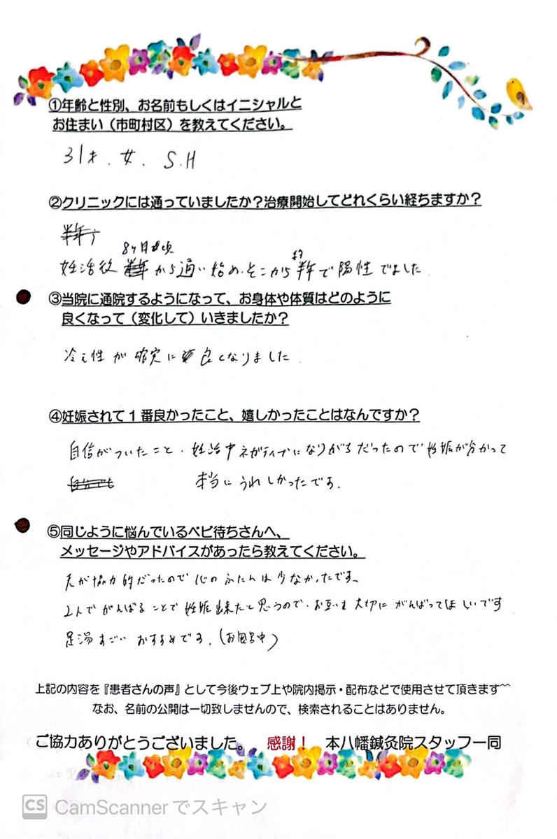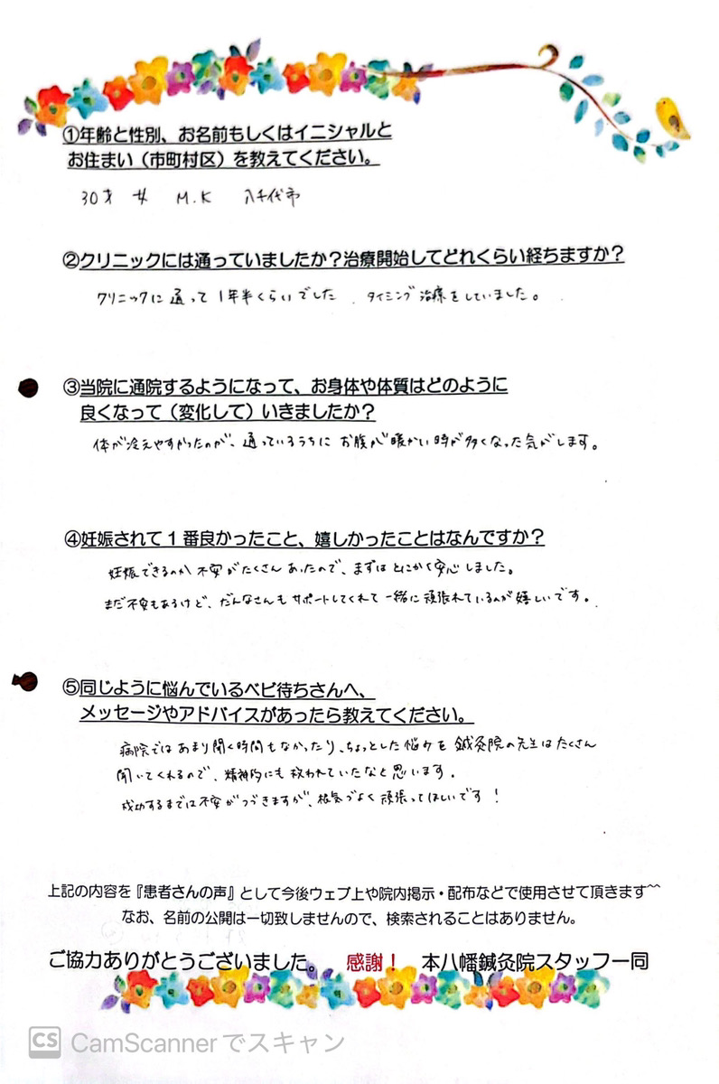 【主訴・年齢・性別】 妊活・30歳・女性 【クリニックには通っていましたか?治療開始してどれくらい経ちますか?】 クリニックに通って1年半くらいでした。 タイミングで治療をしていました。 【当院の通院するようになって、お身体や体質はどのように変化していきましたか?】 殻が冷えやすかったのでが、通っているうちにお腹が温かい時が多くなった気がします。 【妊娠されて1番良かったこと、嬉しかったことはなんですか?】 妊娠できるのか不安がたくさんあったので、まずはとにかく安心しました。 まだ不安もあるけど、だんなさんもサポートしてくれて一緒に頑張れているのが嬉しいです。 【同じように悩んでいるベビ待ちさんへメッセージがあったら教えてください。】 病院ではあまり聞く時間もなかったり、ちょっとした悩みを鍼灸院の先生はたくさん聞いてくれるので、精神的にも救われていたなと思います。 成功するまで不安がつづきますが、根気づよく頑張ってほしいです!」