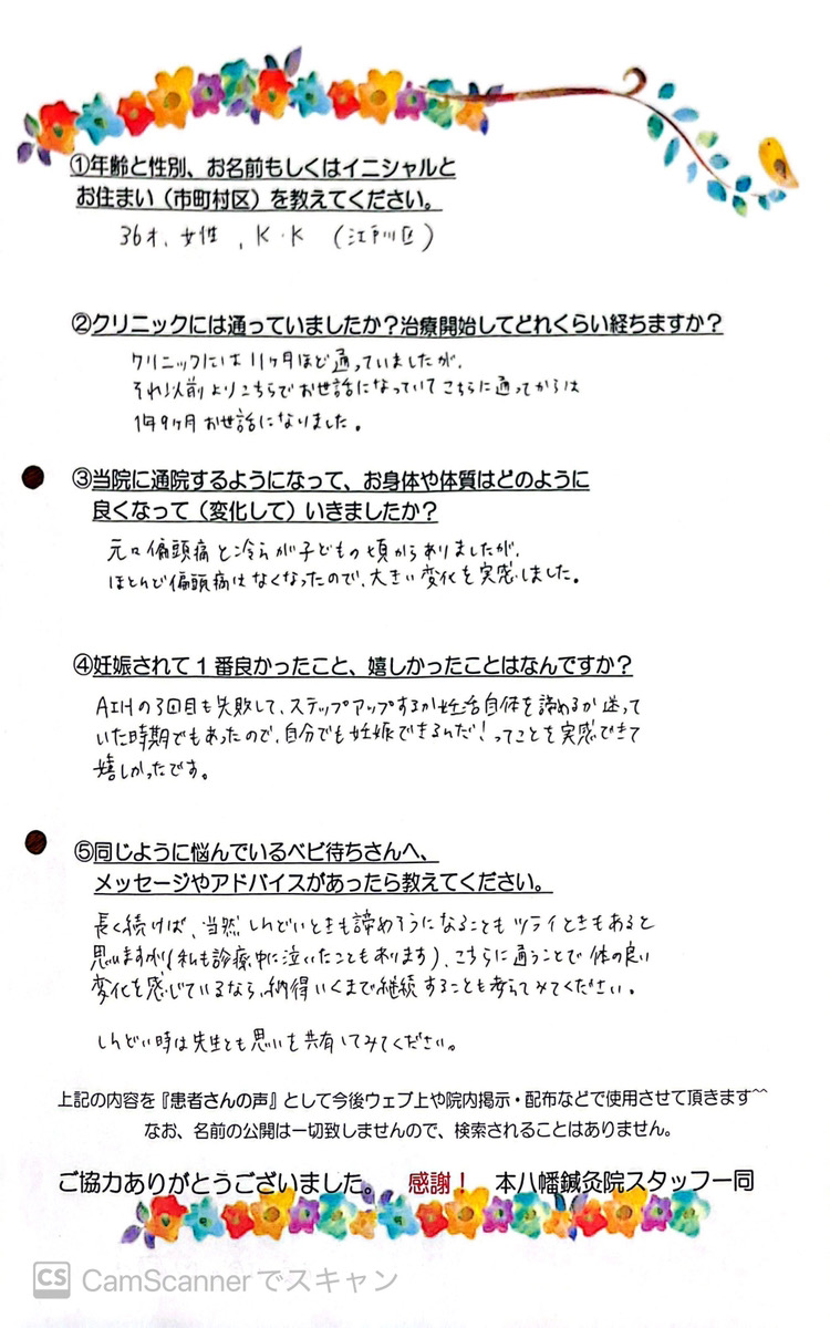【主訴・年齢・性別】 妊活・35歳・女性 【クリニックには通っていましたか?治療開始してどれくらい経ちますか?】 通っていました。(レディースクリニック) 半年ちょっと。 【当院の通院するようになって、お身体や体質はどのように変化していきましたか?】 頭痛でよく悩まされていたのですが、通院し始めてから頭痛をあまり感じなくなったり、起きたとしても軽いものだったりと楽になりました。 また、冷えもだいぶ改善された実感がありました。 【妊娠されて1番良かったこと、嬉しかったことはなんですか?】 思ったように妊娠出来ず、また以前病気をしていた事もあり不安が大きかったので、妊娠出来た事が嬉しかったです!! 【同じように悩んでいるベビ待ちさんへメッセージがあったら教えてください。】 何か少しでも身体にとって良いのではないかなと思う事は、出来る範囲でどんどん取り入れてみると良いのではと思います!!