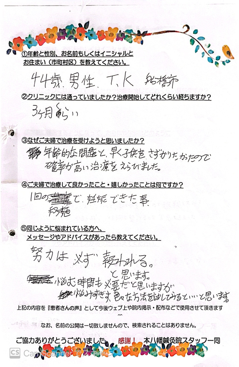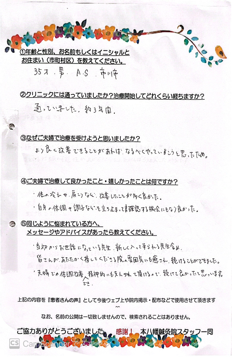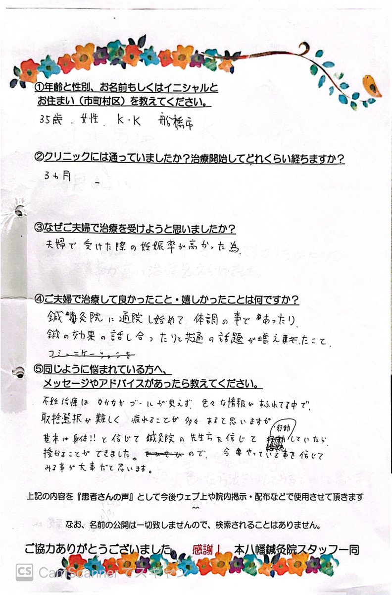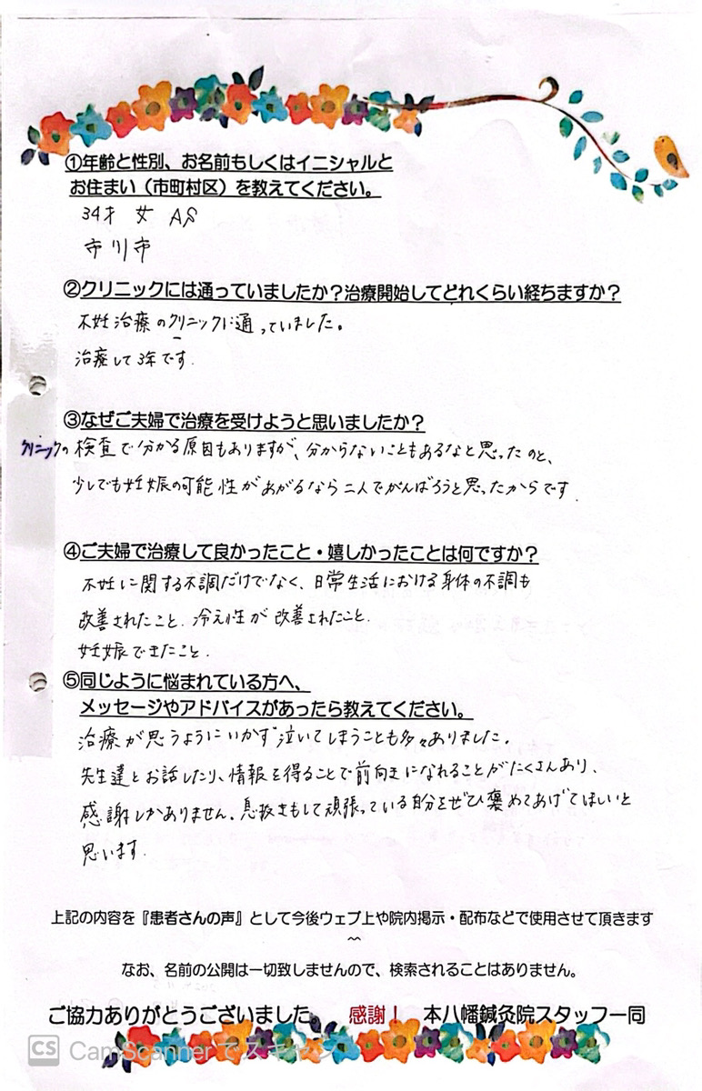 【主訴・年齢・性別】 妊活・34歳・女性 【クリニックには通っていましたか?治療開始してどれくらい経ちますか?】 不妊治療のクリニックに通っていました。 治療して3年です。 【なぜご夫婦で治療を受けようと思いましたか?】 クリニックの検査でわかる原因もありますが、分からないこともあるなと思たのと、少しでも妊娠の可能性があがるなら二人でがんばろうと思ったからです。 【ご夫婦で治療して良かった事・うれしかった事は何ですか?】 不妊に関する不調だけでなく、日常生活における身体の不調も改善されたこと。 冷え性が改善されたこと。 妊娠できたこと。 【同じように悩んでいるベビ待ちさんへメッセージがあったら教えてください。】 治療が思うようにいかず泣いてしまうことも多々ありました。 先生達とお話したり、情報を得ることで前向きになれることがたくさんあり、感謝しかありません。 息抜きもして頑張っている自分をぜひ褒めてあげてほしいと思います。