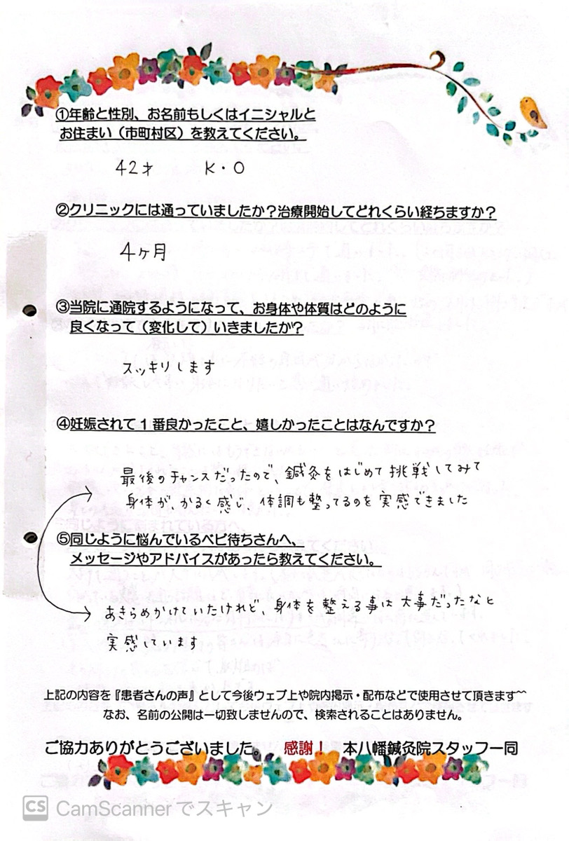 【主訴・年齢・性別】 妊活・42歳・女性 【クリニックには通っていましたか?治療開始してどれくらい経ちますか?】 4カ月 【当院の通院するようになって、お身体や体質はどのように変化していきましたか?】 スッキリします。 【妊娠されて1番良かったこと、嬉しかったことはなんですか?】 あきらめかけていたけれど、身体を整える事は大事だったなと実感しています。 【同じように悩んでいるベビ待ちさんへメッセージがあったら教えてください。】 最後のチャンスだったので、鍼灸をはじめて挑戦してみて身体がかるく感じ、体調も整ているのを実感できました。