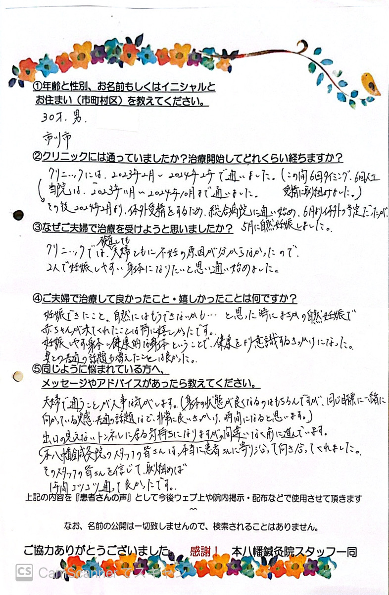 【主訴・年齢・性別】 妊活・30歳・男性 【クリニックには通っていましたか?治療開始してどれくらい経ちますか?】 クリニックは2023年2月~2024年2月で通いました。(この間6回タイミング、6回人工授精に取り組みました。) その後2024年2月より体外受精をするため、総合病院に通い始め、6月より体外受精の予定だったが、5月に自然妊娠しました。 当院は、2023年11月~2024年10月まで通いました。 【なぜご夫婦で治療を受けようと思いましたか?】 クリニックでは検査しても、夫婦ともに不妊の原因が分からなかったので、2人で妊娠しやすい身体になりたいと思い通い始めました。 【ご夫婦で治療して良かった事・うれしかった事は何ですか?】 妊娠できたこと。自然にはもう無理かも・・・と思った時にまさかの自然妊娠で、赤ちゃんが来てくれたことは特に嬉しかったです。 妊娠しやすい身体=健康的な身体ということで、健康をより意識するきっかけになった。 妻との共通の話題も増えたことは良かった。 【同じように悩んでいるベビ待ちさんへメッセージがあったら教えてください。】 夫婦で通うことが大事な気がします。(身体の状態が良くなるのはもちろんですが、同じ目標に一緒に向かっている実感、共通の話題など、非常に良いきっかけ、時間になると思います。) 出口の見えないトンネルに居る気持ちになりますが、本八幡鍼灸院のスタッフの皆さんは、本当に患者さんに寄り添って向き合ってくれました。 そのスタッフの皆さんを信じて取り組めば、間違いなく前に進んでいます。 1年間コツコツ通って良かったです。