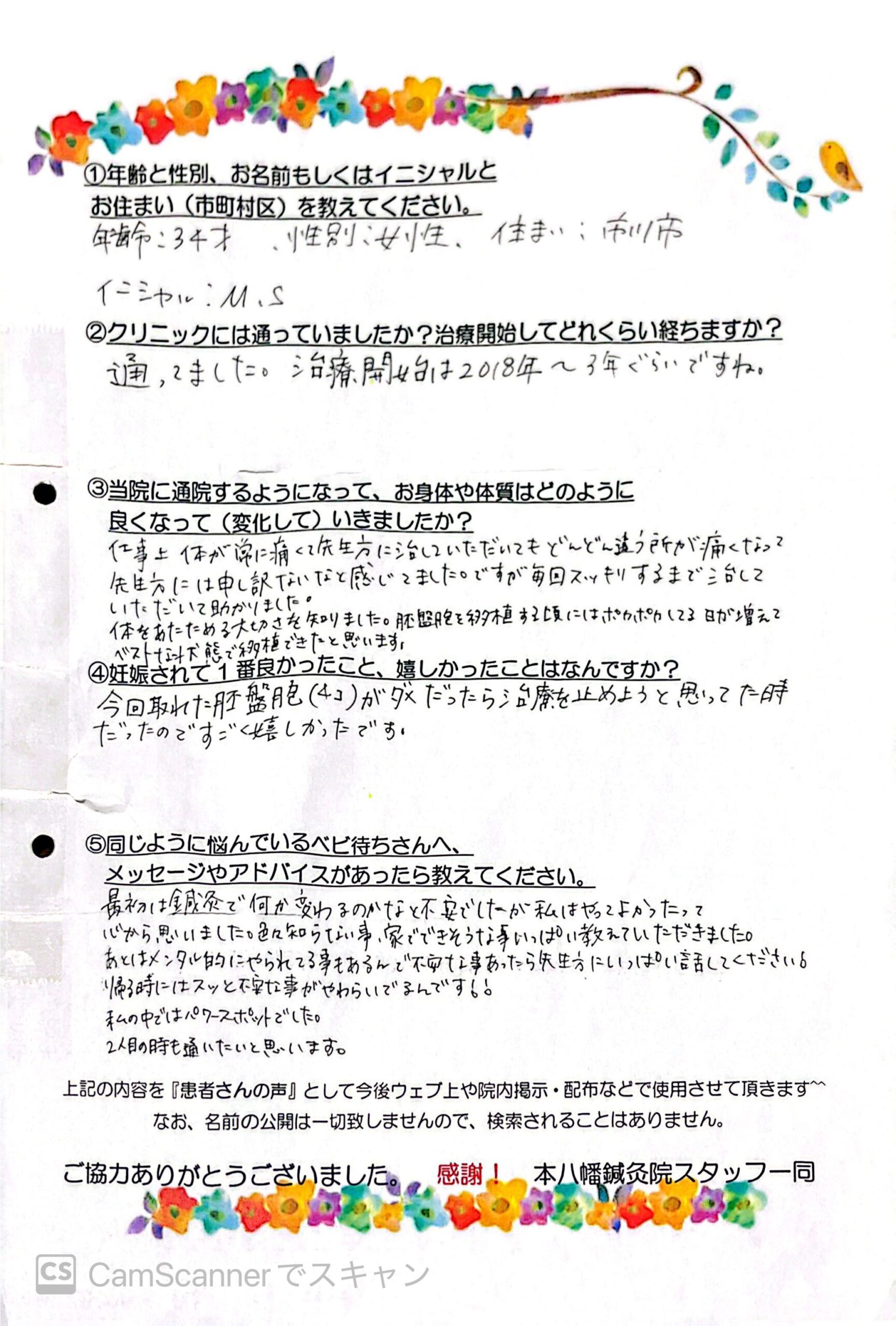 【主訴・年齢・性別】 妊活・34歳・女性 【クリニックには通っていましたか?治療開始してどれくらい経ちますか?】 通っていました。 治療開始は2018年~3年くらいですね。 【当院の通院するようになって、お身体や体質はどのように変化していきましたか?】 仕事上体が常に痛くて、先生方に治していただいてもどんどん違う所が痛くなって、先生方には申し訳ないと感じていました。 ですが、毎回スッキリするまで治していただいて助かりました。 体をあたためる大切さを知りました。 胚盤胞を移植する頃にはポカポカしている日が増えて、ベストな状態で移植できたと思います! 【妊娠されて1番良かったこと、嬉しかったことはなんですか?】 今回取れた胚盤胞(4個)がダメだったら治療を止めようと思っていた時だったので、すごく嬉しかったです。 【同じように悩んでいるベビ待ちさんへメッセージがあったら教えてください。】 最初は鍼灸で何が変わるのかなと不安でしたが、私はやってよかったって心から思いました。 色々知らない事、家でできそうな事をいっぱい教えていただきました。 あとはメンタル的にやられる事もあるので、不安な事があったら先生方にいっぱい話してください! 私の中ではパワースポットでした。 2人目の時も通いたいと思います。