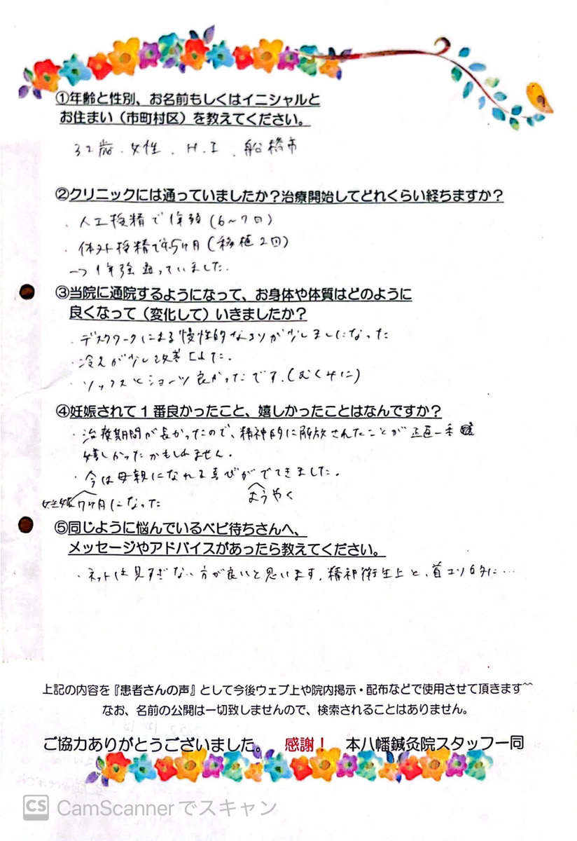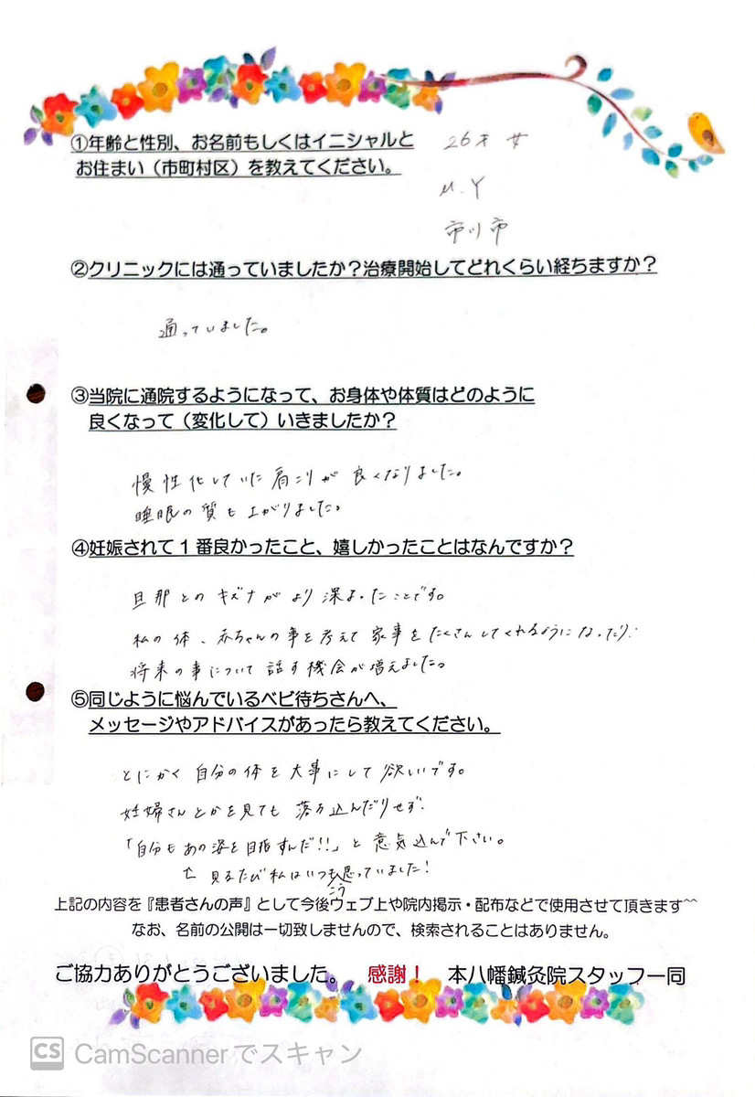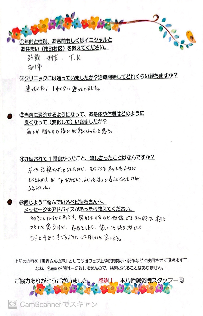 【主訴・年齢・性別】 妊活・36歳・女性 【クリニックには通っていましたか?治療開始してどれくらい経ちますか?】 通っていた。 1年くらい通っていました。 【当院の通院するようになって、お身体や体質はどのように変化していきましたか?】 肩とか腰とかの痛みが軽くなったと思う。 【妊娠されて1番良かったこと、嬉しかったことはなんですか?】 不妊治療をずっとしていたので、そのことを知ってた人など、たくさんの人が「おめでとう、よかったね」と喜んでくれたのがうれしかった。 【同じように悩んでいるベビ待ちさんへメッセージがあったら教えてください。】 やれることはすべてやったり、努力しているのに妊娠できない時は、本当につらいと思うけど、息抜きしたり、楽しいことしたりしながら、自分を信じて過ごすようにしてほしいと思います。