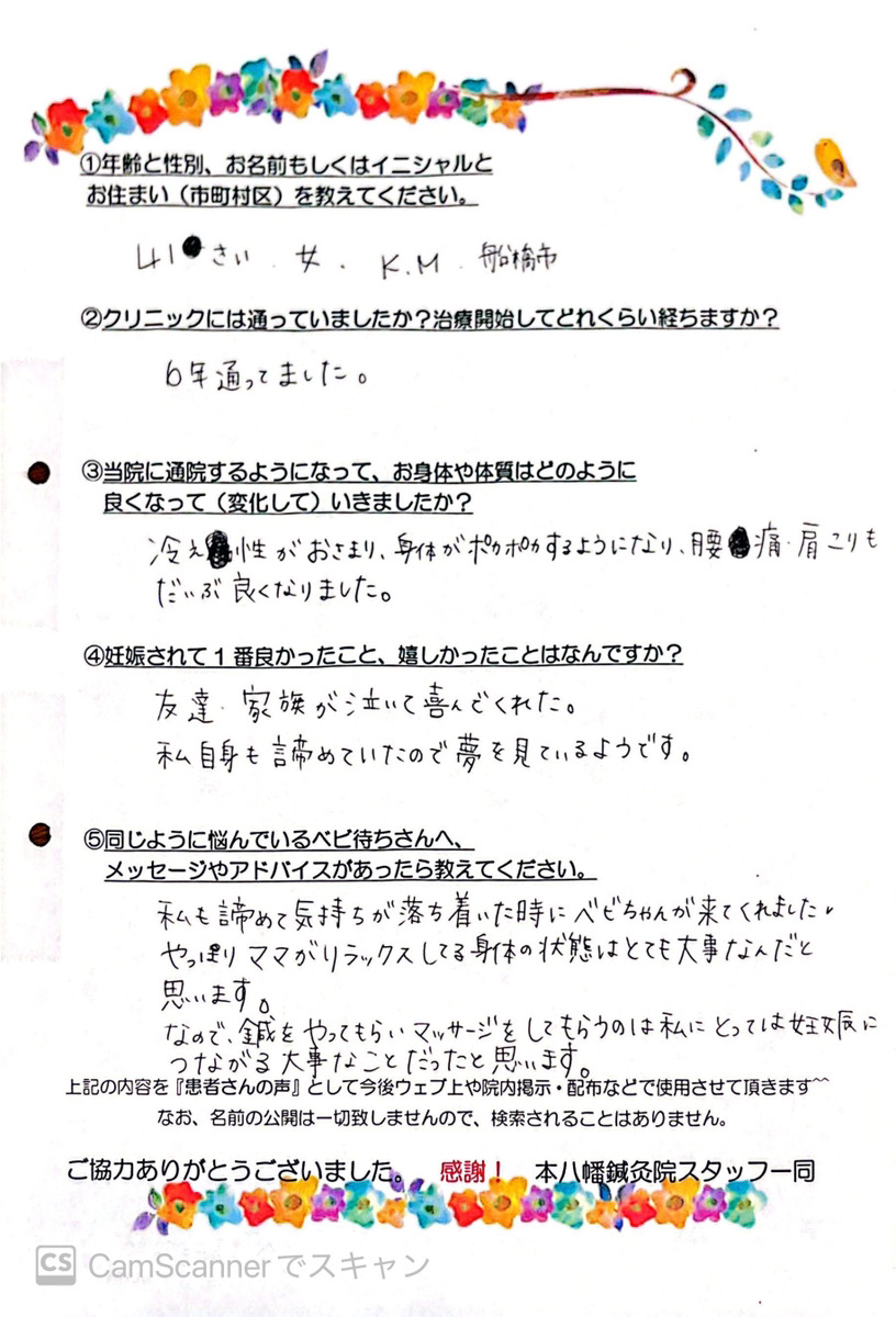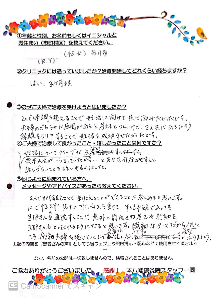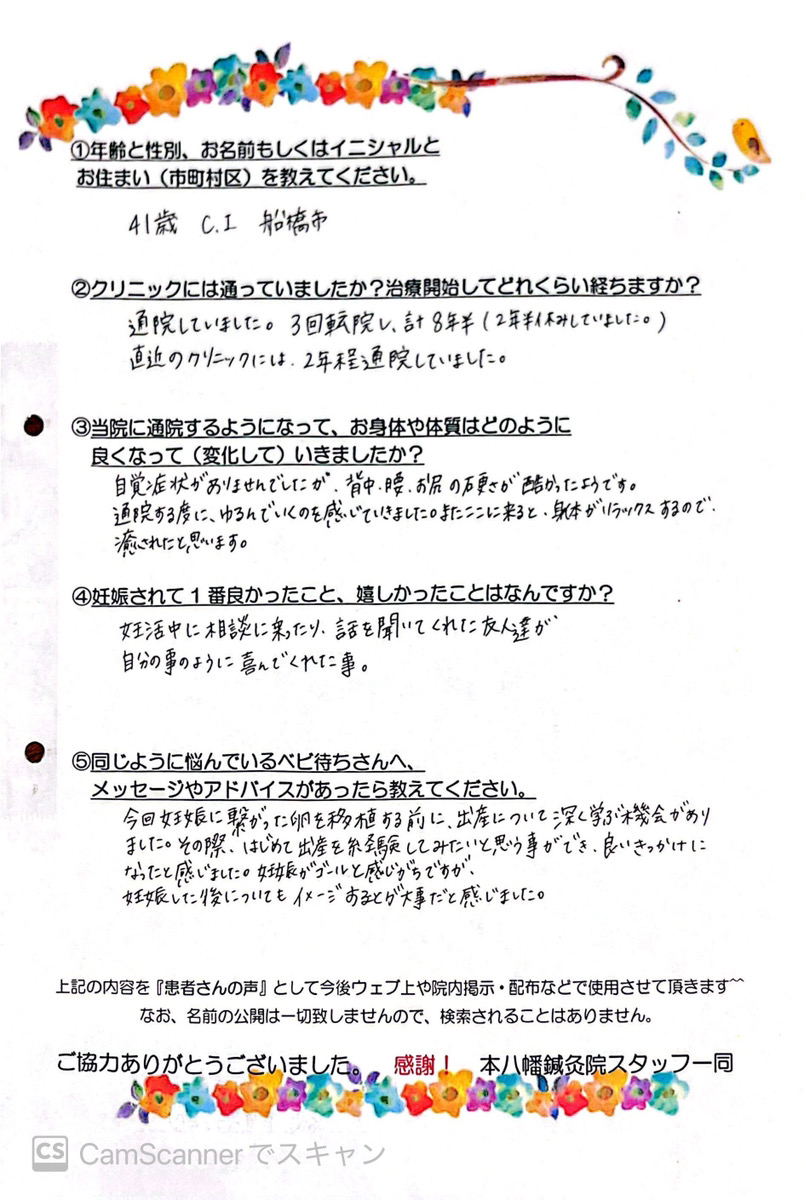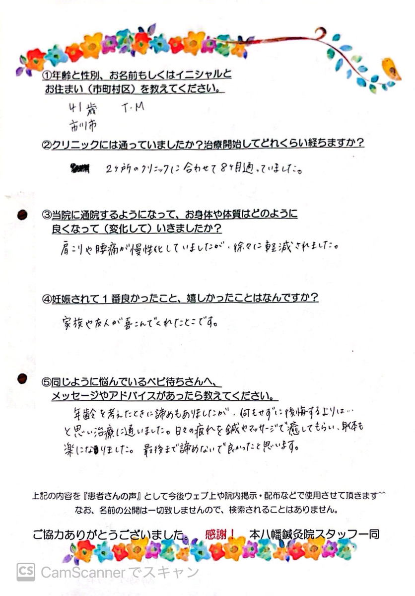 【主訴・年齢・性別】 妊活・41歳・女性 【クリニックには通っていましたか?治療開始してどれくらい経ちますか?】 2カ所のクリニックに、合わせて8カ月通っていました。 【当院の通院するようになって、お身体や体質はどのように変化していきましたか?】 肩こりや腰痛が慢性化していましたが、徐々に軽減されました。 【妊娠されて1番良かったこと、嬉しかったことはなんですか?】 家族や友人が喜んでくれたことです。 【同じように悩んでいるベビ待ちさんへメッセージがあったら教えてください。】 年齢を考えたときに諦めもありましたが、何もせずに後悔するよりは・・・と思い治療に通いました。 日々の疲れを鍼やマッサージで癒してもらい、身体も楽になりました。 最後まで諦めないで良かったと思います。