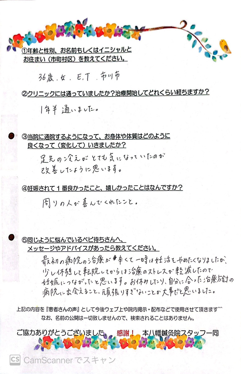 【主訴・年齢・性別】 妊活・36歳・女性 【クリニックには通っていましたか?治療開始してどれくらい経ちますか?】 1年半通いました。 【当院の通院するようになって、お身体や体質はどのように変化していきましたか?】 足先の冷えがとても気になっていたのが、改善したように思います。 【妊娠されて1番良かったこと、嬉しかったことはなんですか?】 周りの人が喜んでくれたこと。 【同じように悩んでいるベビ待ちさんへメッセージがあったら教えてください。】 最初の病院の治療が辛くて一時は妊活をやめたくなりましたが、少し休憩をとった転院してからは、治療のストレスが軽減したので、妊娠につながったと思います。 お休みしたり、自分に合った治療方針の病院に出会えること、頑張りすぎないことが大事だと思いました。