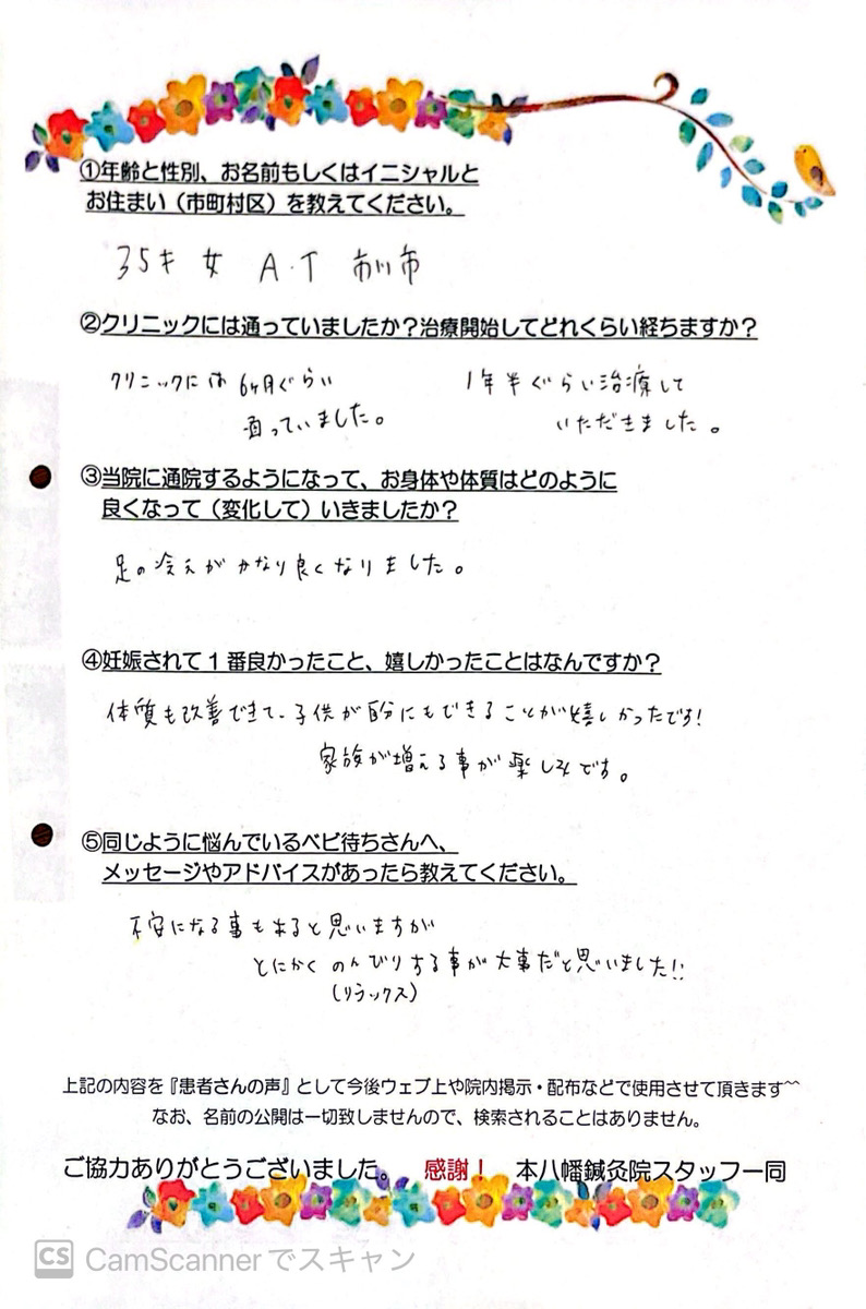 【主訴・年齢・性別】 妊活・35歳・女性 【クリニックには通っていましたか?治療開始してどれくらい経ちますか?】 クリニックには6か月通っていました。 1年半ぐらい治療していただきました。 【当院の通院するようになって、お身体や体質はどのように変化していきましたか?】 足の冷えがかなり良くなりました。 【妊娠されて1番良かったこと、嬉しかったことはなんですか?】 体質も改善でき、子供が自分にもできることが嬉しかったです! 家族が増える事が楽しみです。 【同じように悩んでいるベビ待ちさんへメッセージがあったら教えてください。】 不安になる事もあると思いますが、とにかくのんびり(リラックス)する事が大事だと思いました!