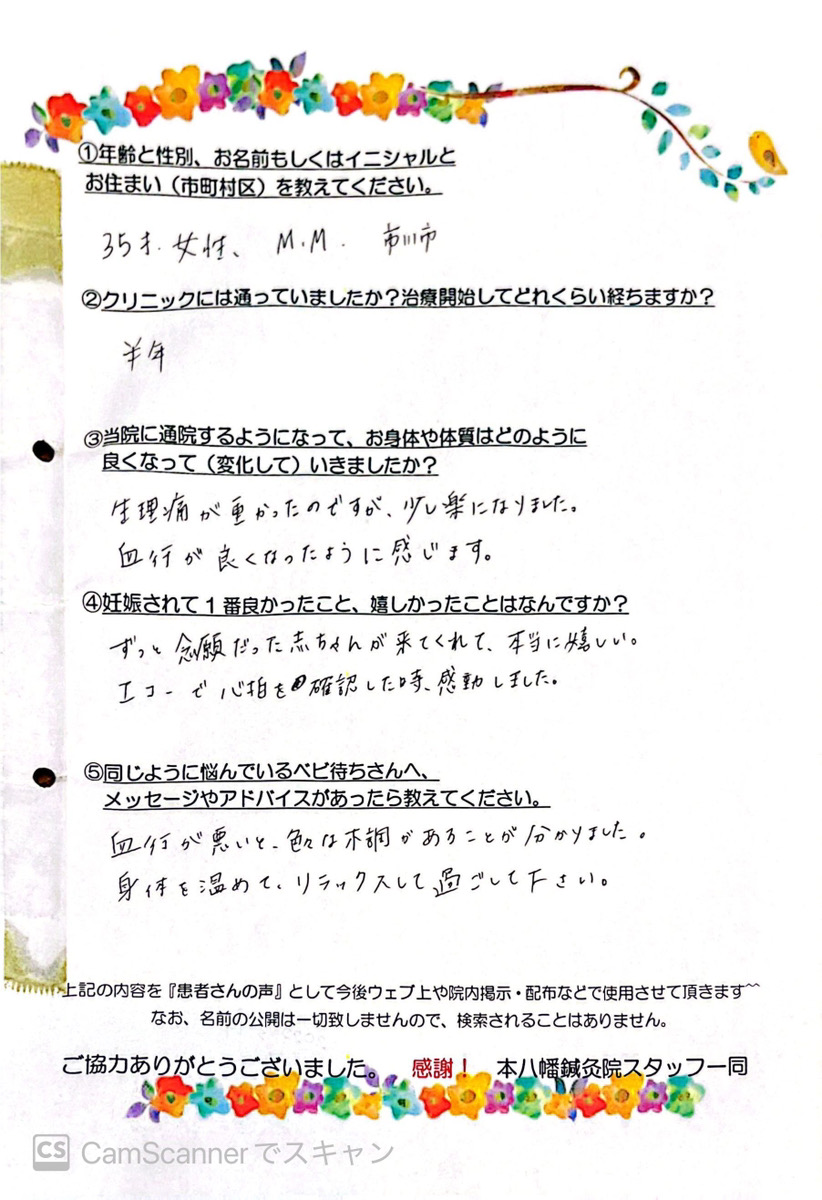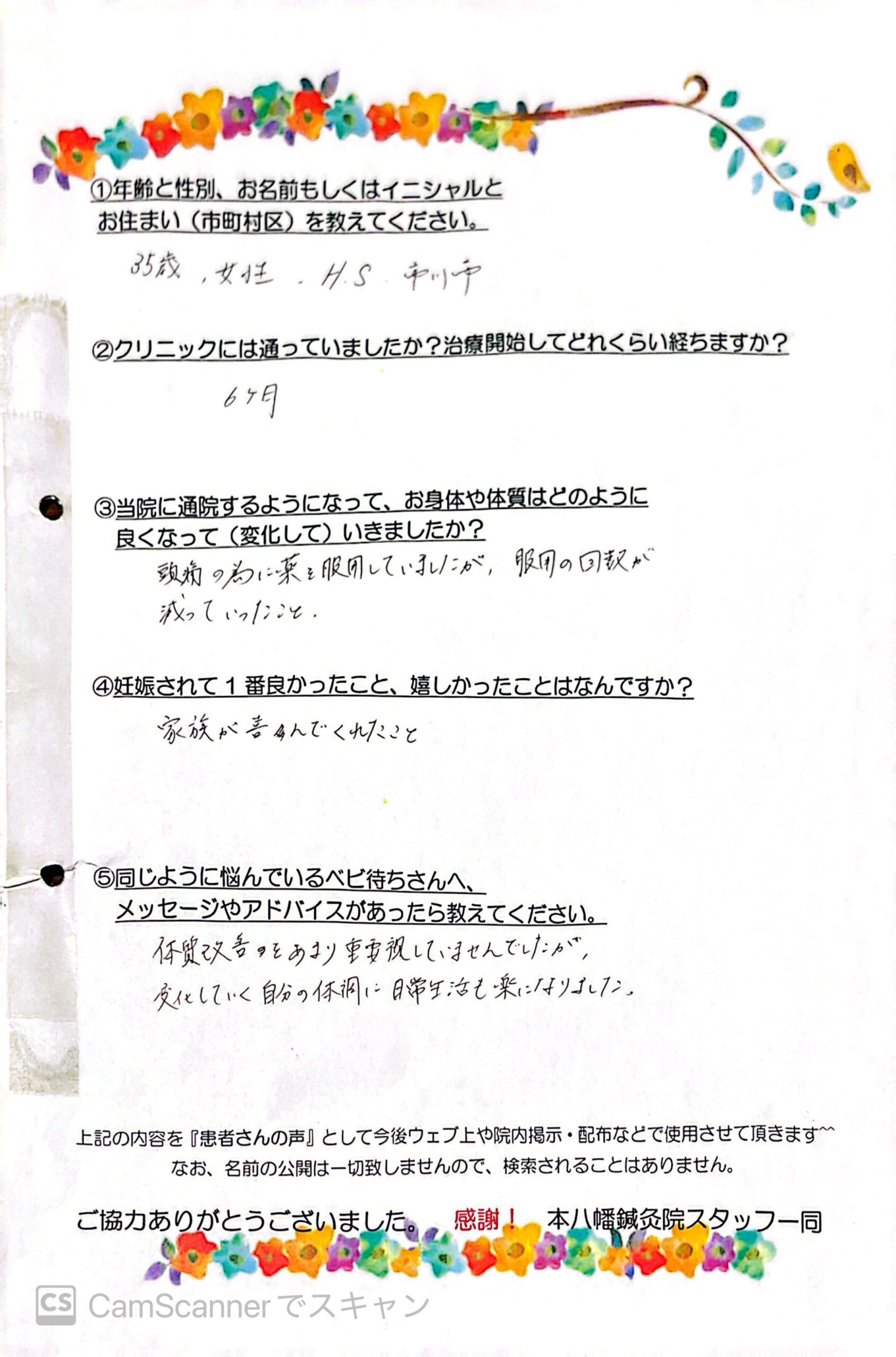 【主訴・年齢・性別】 妊活・35歳・女性 【クリニックには通っていましたか?治療開始してどれくらい経ちますか?】 半年 【当院の通院するようになって、お身体や体質はどのように変化していきましたか?】 生理痛が重かったのですが、少し楽になりました。 血行が良くなったように感じます。 【妊娠されて1番良かったこと、嬉しかったことはなんですか?】 ずっと念願だった赤ちゃんが来てくれて、本当に嬉しい。 エコーで心拍を確認した時、感動しました。 【同じように悩んでいるベビ待ちさんへメッセージがあったら教えてください。】 血行が悪いと、色々な不調があることが分かりました。 身体を温めて、リラックスして過ごして下さい。