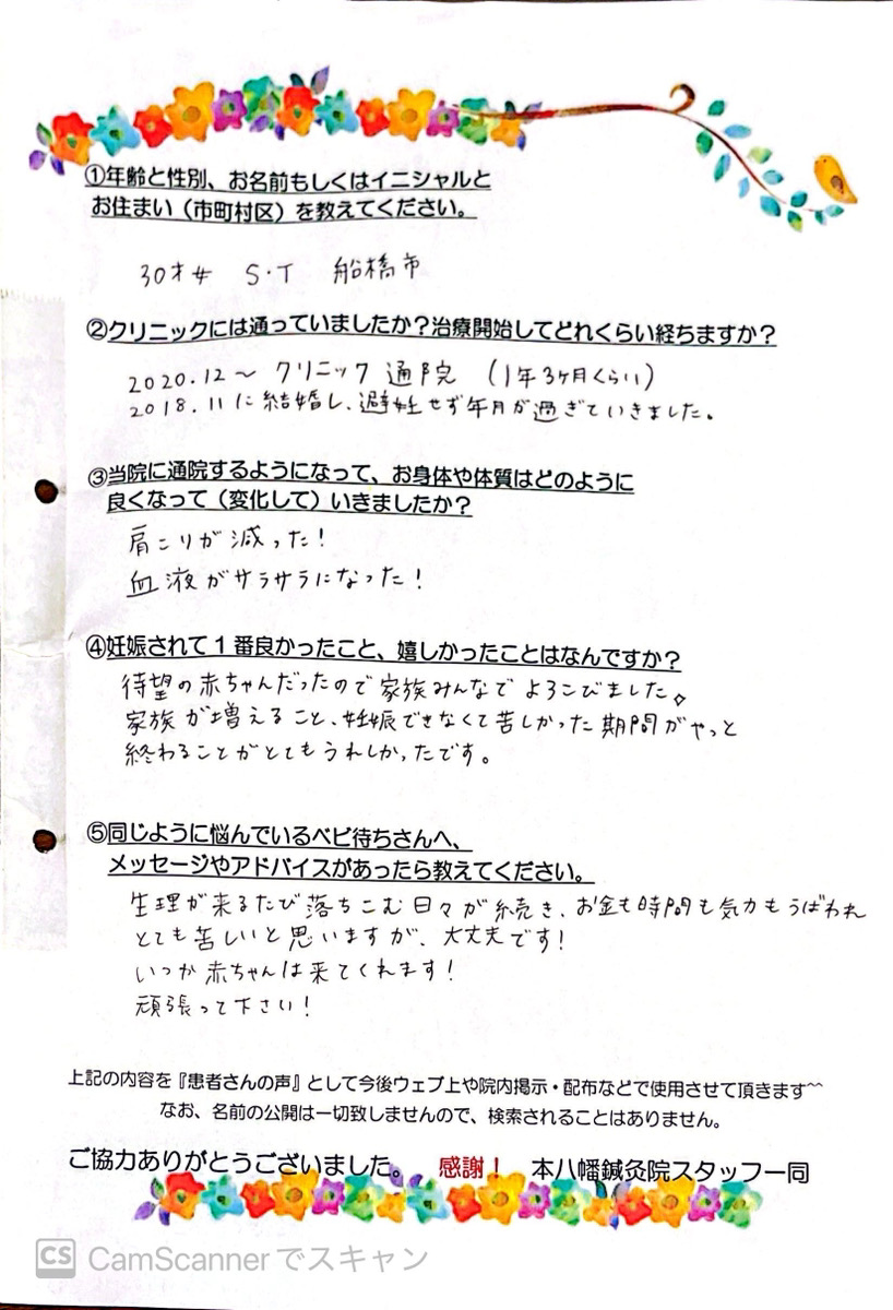 【主訴・年齢・性別】 妊活・30歳・女性 【クリニックには通っていましたか?治療開始してどれくらい経ちますか?】 2020.12~ クリニック通院(1年3カ月くらい) 2018.11 に結婚し、避妊せず年月が過ぎていきました。 【当院の通院するようになって、お身体や体質はどのように変化していきましたか?】 肩こりが減った! 血液がサラサラになった! 【妊娠されて1番良かったこと、嬉しかったことはなんですか?】 待望の赤ちゃんだったので家族みんなで喜びました。 家族が増えること、妊娠できなくて苦しかった期間がやっと終わることが、とてもうれしかったです。 【同じように悩んでいるベビ待ちさんへメッセージがあったら教えてください。】 生理が来るたび落ち込む日々が続き、お金も時間も気力も奪われ、とても苦しいと思いますが、大丈夫です! いつか赤ちゃんは来てくれます!頑張って下さい!