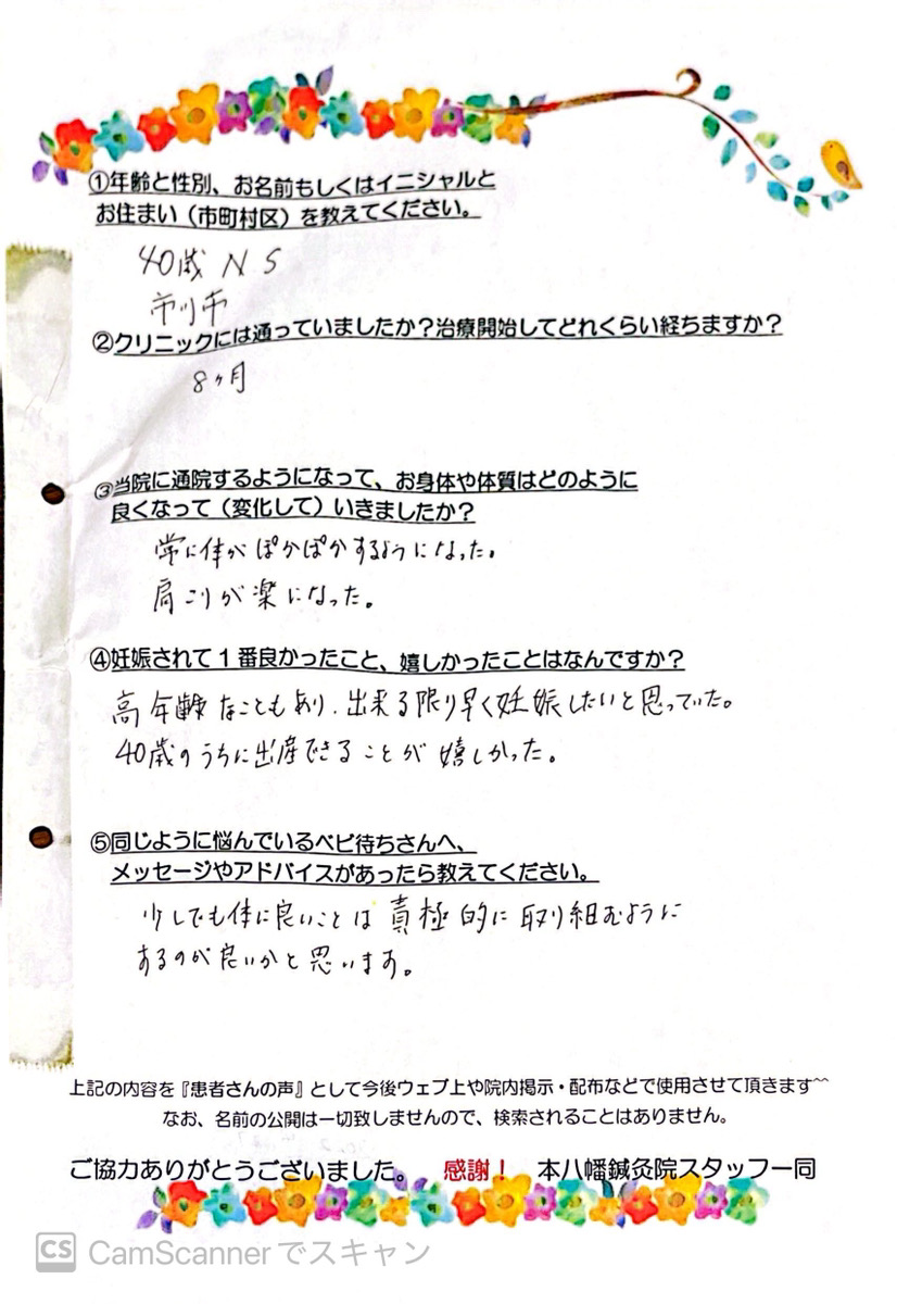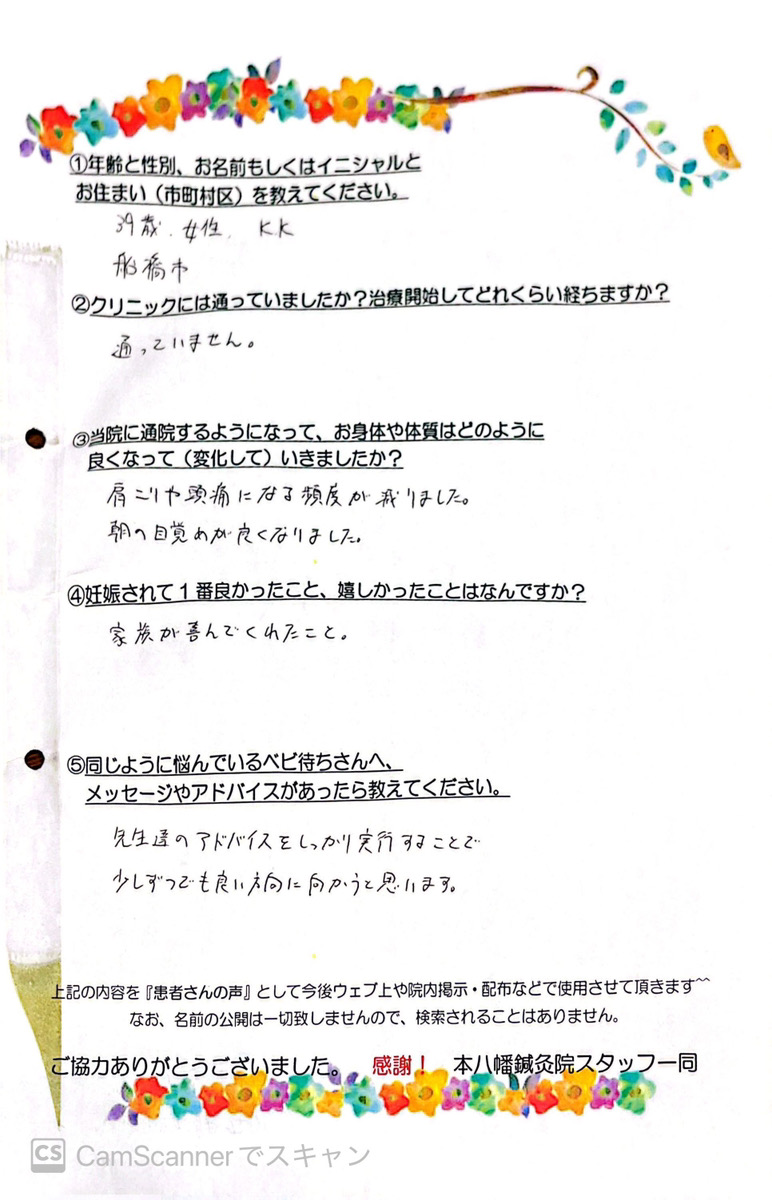 【主訴・年齢・性別】 妊活・40歳・女性 【クリニックには通っていましたか?治療開始してどれくらい経ちますか?】 8カ月 【当院の通院するようになって、お身体や体質はどのように変化していきましたか?】 常に体がぽかぽかするようになった。 肩こりが楽になった。 【妊娠されて1番良かったこと、嬉しかったことはなんですか?】 高齢なこともあり、出来る限り早く妊娠したいと思っていた。 40歳のうちに出産できることが嬉しかった。 【同じように悩んでいるベビ待ちさんへメッセージがあったら教えてください。】 少しでも体に良いことは積極的に取り組むようにするのが良いかと思います。
