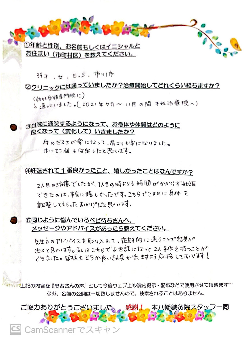 【主訴・年齢・性別】 妊活・39歳・女性 【クリニックには通っていましたか?治療開始してどれくらい経ちますか?】 体外受精専門院に通っていました。(2021年7月~11月の間不妊治療院へ) 【当院の通院するようになって、お身体や体質はどのように変化していきましたか?】 体のだるさが楽になって、肩コリも楽になりました。 ホルモン値も安定したと思います。 【妊娠されて1番良かったこと、嬉しかったことはなんですか?】 2人目の治療でしたが、1人目の時よりも時間がかからず妊娠できたのは、本当に嬉しかったです。 こちらでこまめに身体を調整してもらったおかげだと思います。 【同じように悩んでいるベビ待ちさんへメッセージがあったら教えてください。】 先生方のアドバイスを取り入れて、定期的に通うことで結果が出ると思います。 私はこちらでお世話になって、2人子供を持つことができました。 皆様もどうか良い結果が出ますよう応援しております!
