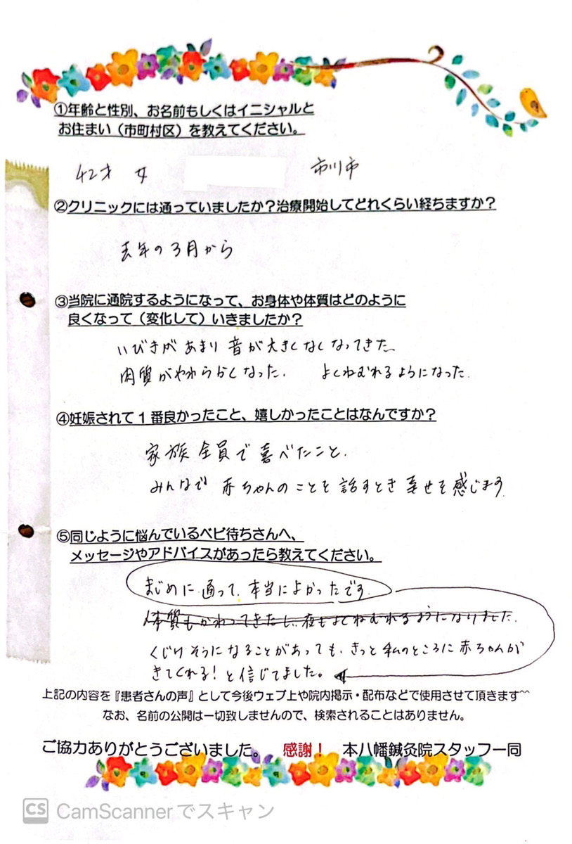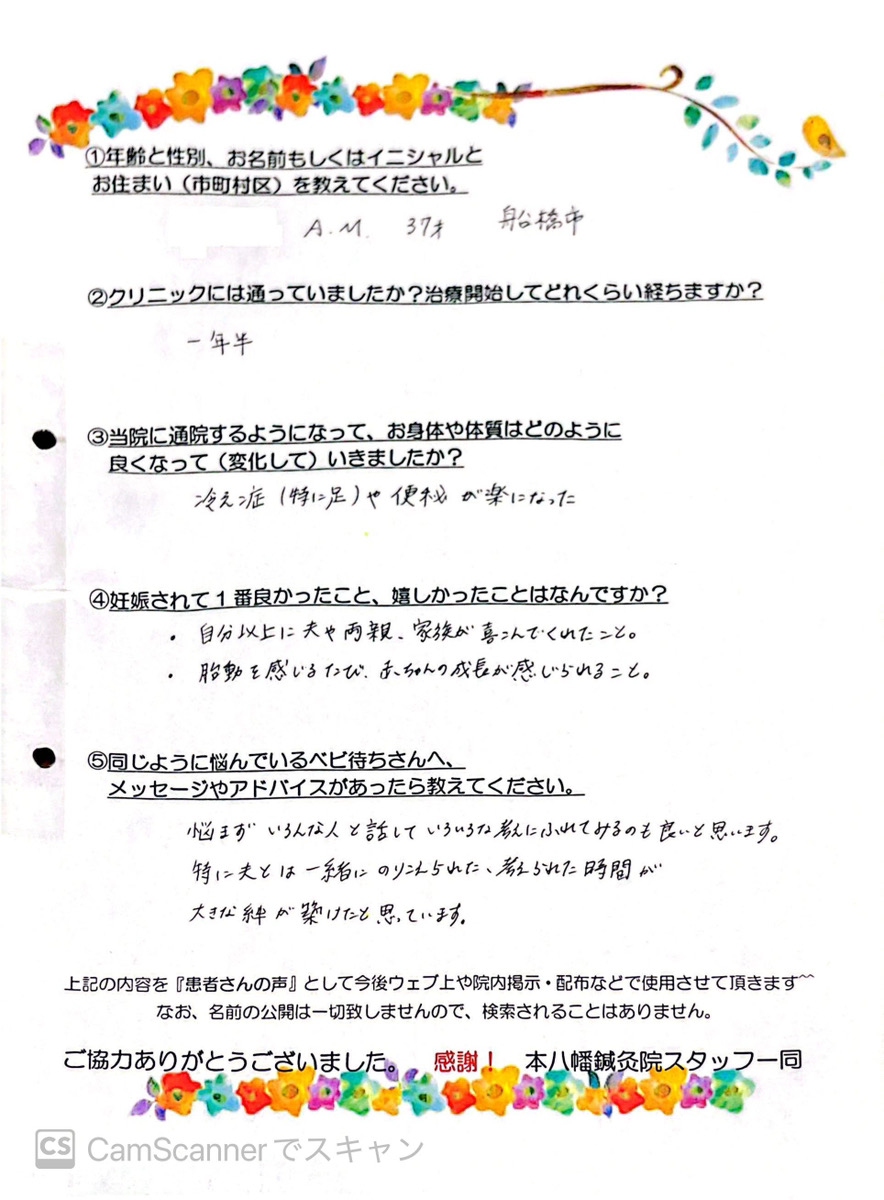 【主訴・年齢・性別】 妊活・37歳・女性 【クリニックには通っていましたか?治療開始してどれくらい経ちますか?】 一年半 【当院の通院するようになって、お身体や体質はどのように変化していきましたか?】 冷え性(特に足)や便秘が楽になった。 【妊娠されて1番良かったこと、嬉しかったことはなんですか?】 自分以上に夫や両親、家族が喜んでくれたこと。 胎動を感じるたび、赤ちゃんの成長が感じられること。 【同じように悩んでいるベビ待ちさんへメッセージがあったら教えてください。】 悩まずいろんな人と話して、いろいろな考えにふれてみるのも良いと思います。 特に夫とは一緒にのりこえられた、考えられた時間が、大きな絆を築けたと思っています。