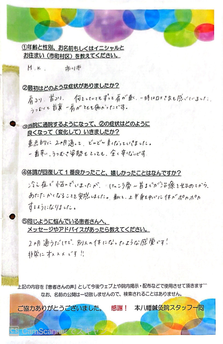 【主訴・年齢・性別】 首肩こり 女性 【最初はどのような症状がありましたか?】 肩こり、首こり。何をしてもずっと肩が重く、一時は吐き気も感じていました。 うつむくと首裏、肩がとても痛かったです。 【当院の通院するようになって、症状はどのように変化していきましたか?】 重点的に2カ月通って、どんどん良くなっていきました。 一番辛い、うつむき姿勢をとっても、全く痛くないです。 【体調が回復して1番良かったこと、嬉しかったことはなんですか?】 冷え性で悩んでいましたが、肩甲骨~首までが、治療を始めてからあたたかくなることを実感しました。 動くと、上半身を中心に体がポカポカするようになりました。 【同じように悩んでいる患者さんへメッセージがあったら教えてください。】 2カ月通うだけで、別人の体になったような感覚です!非常におススメです!